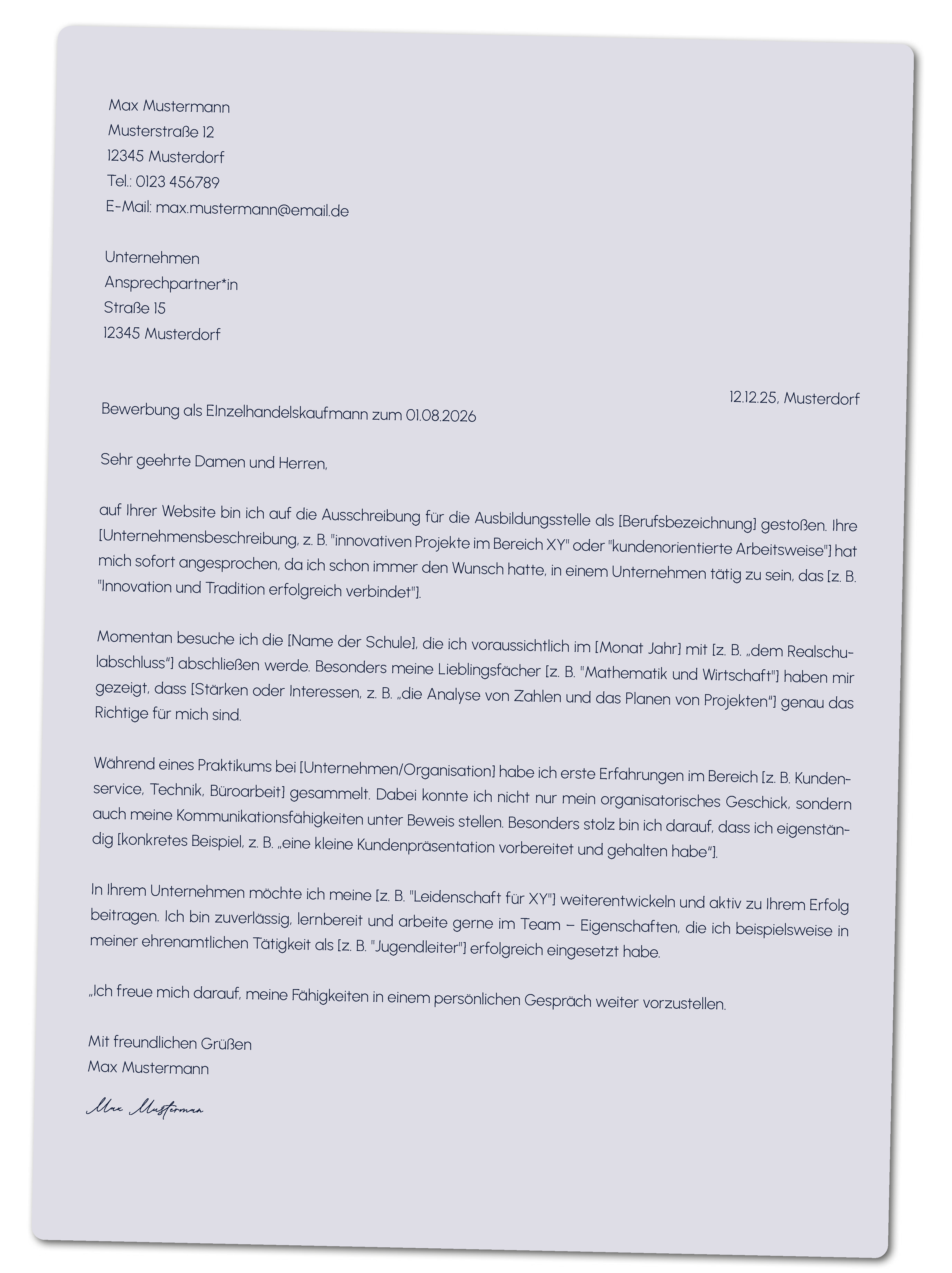 - Schluss: Ort, Datum und deine Unterschrift.